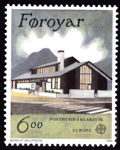 Die Europamarken 1990 sind in Dänemark Färöer zum Gemeinschaftsthema "Postalische Einrichtungen" am 9. April 1990 erschienen. Hier die Marke zu 6,00 Kronen mit der Abbildung des Posthauses in Klaksvík. Die Auflage der Marke betrug 922 000 Stück.
