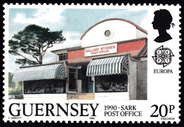 Die Europamarken 1990 sind in Großbritannien-Guernsey zum Gemeinschaftsthema "Postalische Einrichtungen" am 27. Februar 1990 erschienen. Hier eine Marke zu 20 Pence mit der Abbildung des Postamtes auf Sark im Jahre 1990. Die Auflage der Marke betrug 398 759 Stück.