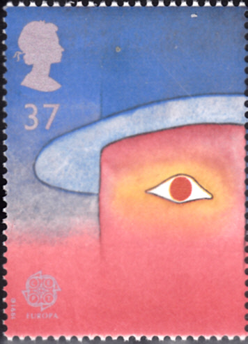 In Großbritannien erschienen die Europamarken 1991 zum Gemeinschaftsthema "Europäische Weltraumfahrt" am 23. April 1991. Hier eine Marke zu 37 Pence mit einer Symbolischen Darstellung von Erde und Weltall. Die Auflage betrug 7 593 000 Stück.