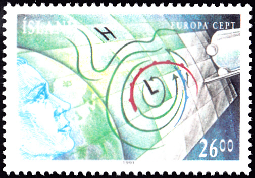In Island erschienen die Europamarken 1991 zum Gemeinschaftsthema "Europäische Weltraumfahrt" am 29. April 1991. Hier die Marke zu 26 Kronen mit einem Gesicht, der Erde, einer Wetterkarte und einem Satelliten. Die Auflage dieser Marke betrug 1 000 000 Stück.