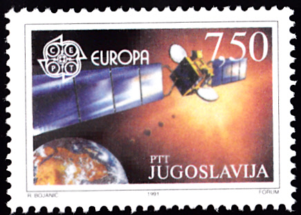 In Jugoslawien erschienen die Europamarken 1991 zum Gemeinschaftsthema "Europäische Weltraumfahrt" am 6. Mai 1991. Hier die Marke zu 7,50 Dinar mit der Abbildung eines Fernmeldesatelliten und der Erde. Die Auflage dieser Marke betrug 283 000 Stück.