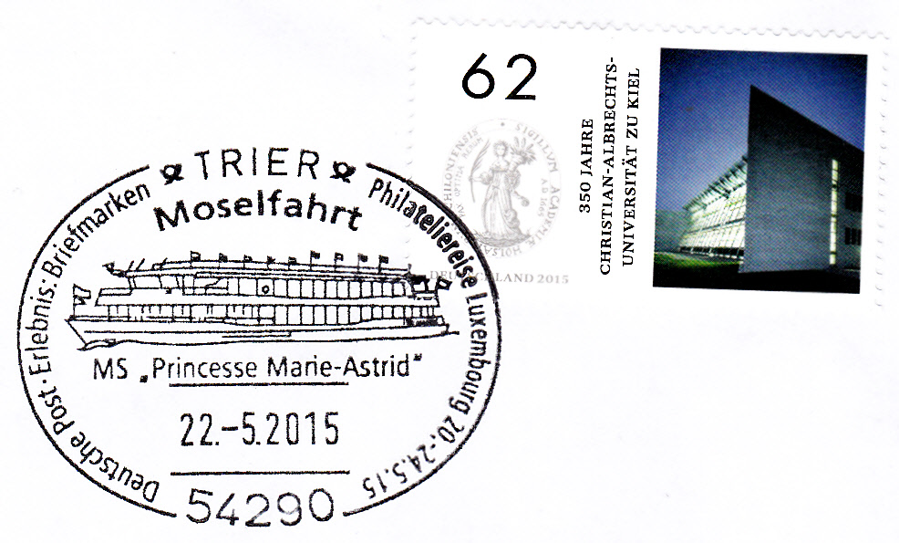 Sonderstempel aus Trier zu einer "Philateliereise nach Luxemburg" mit der MS "Princesse Marie-Astrid" vom 22.5.2015. Im Stempelbild ist das Schiff abgebildet.