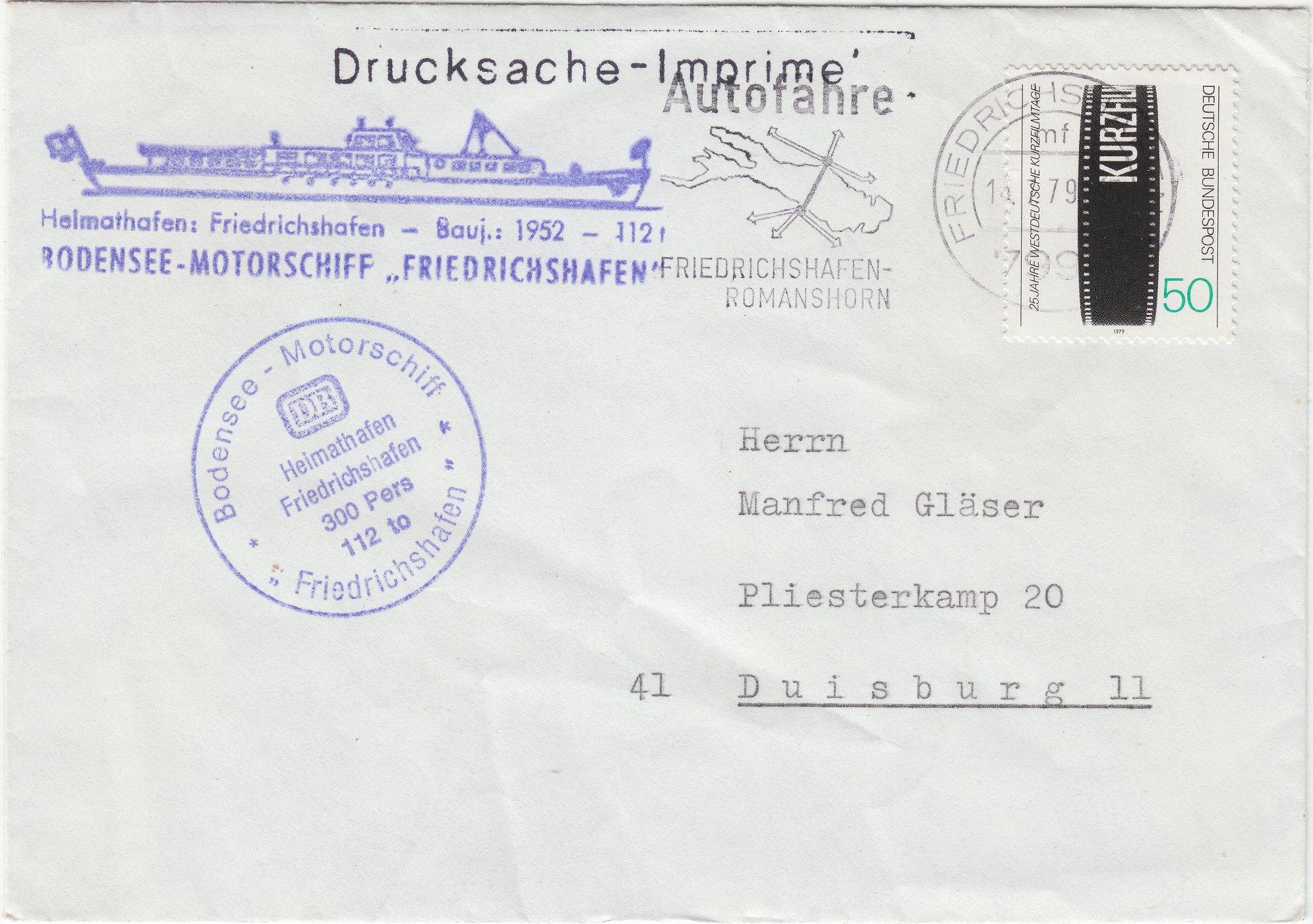 Dieser Beleg vom 14.07.1979 trägt zwei Cachetstempel der MS FRIEDRICHSHAFEN: