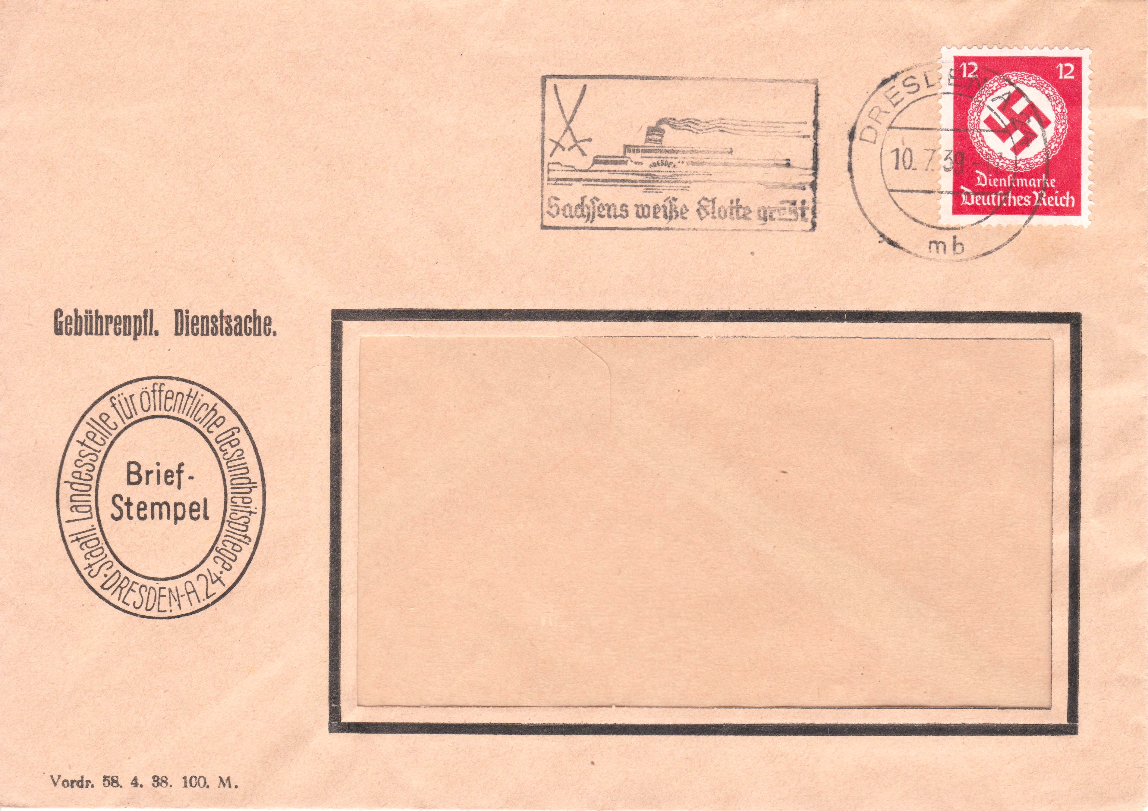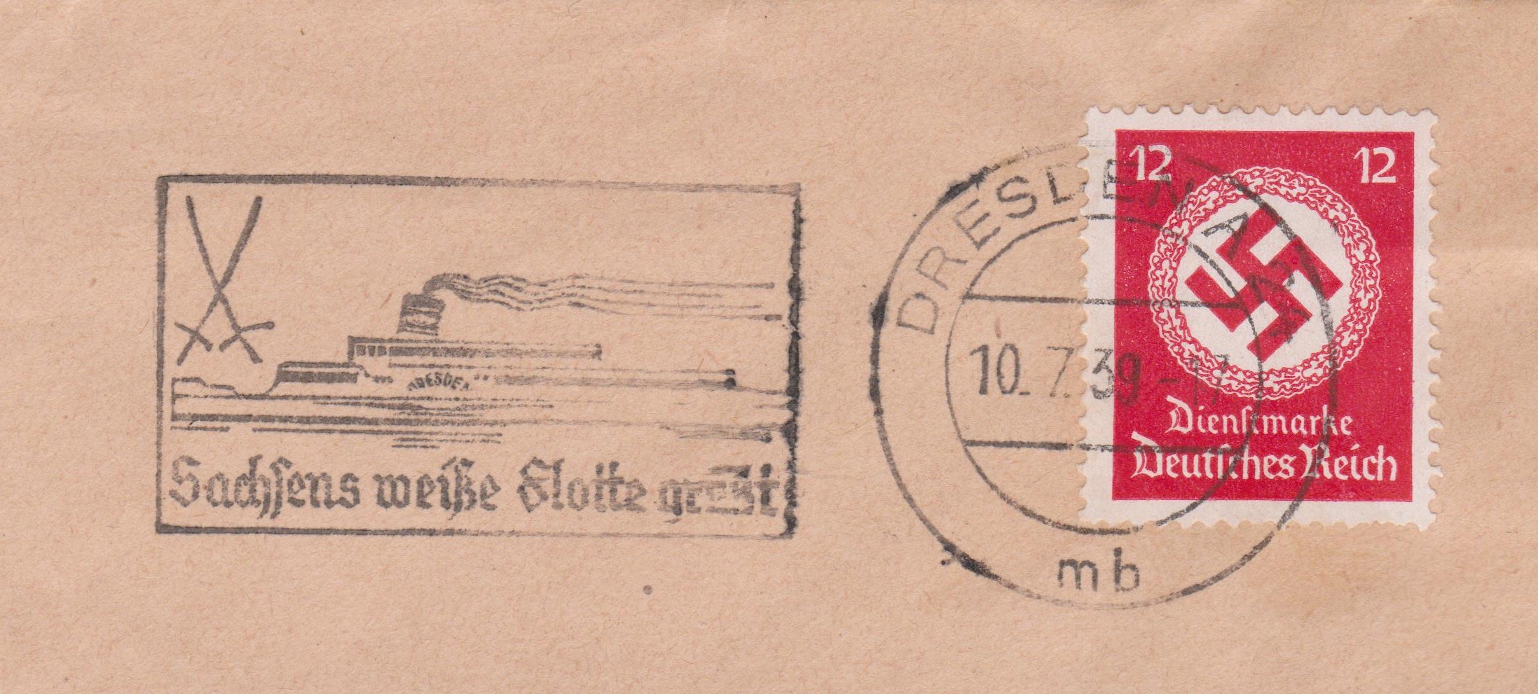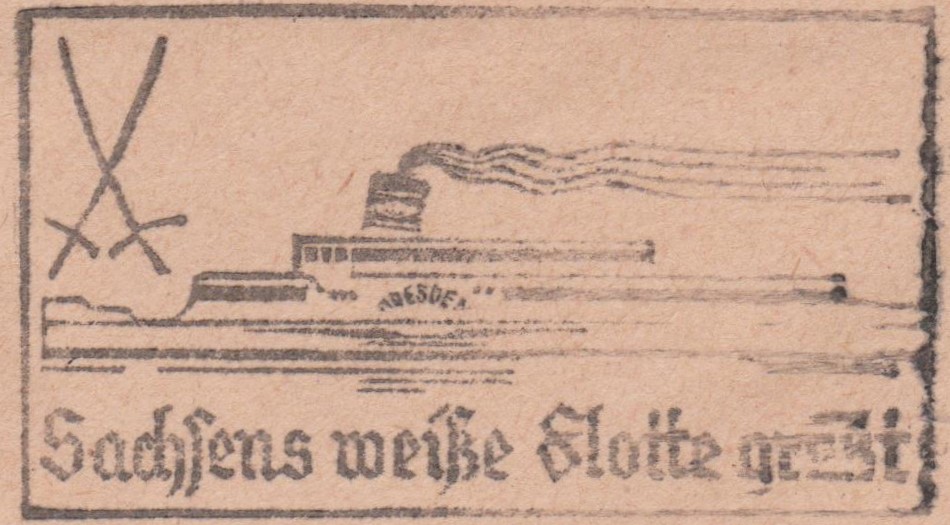 Gebührenpflichtige Dienstsache mit Werbestempel "Sachsens weiße Flotte grüßt" und Abbildung des Schiffes "DRESDEN":