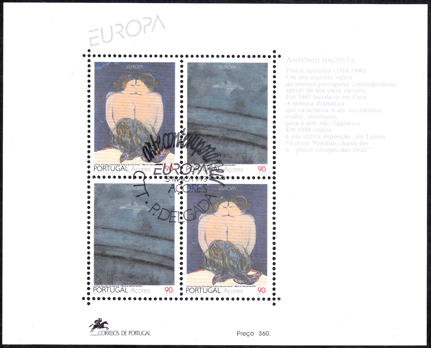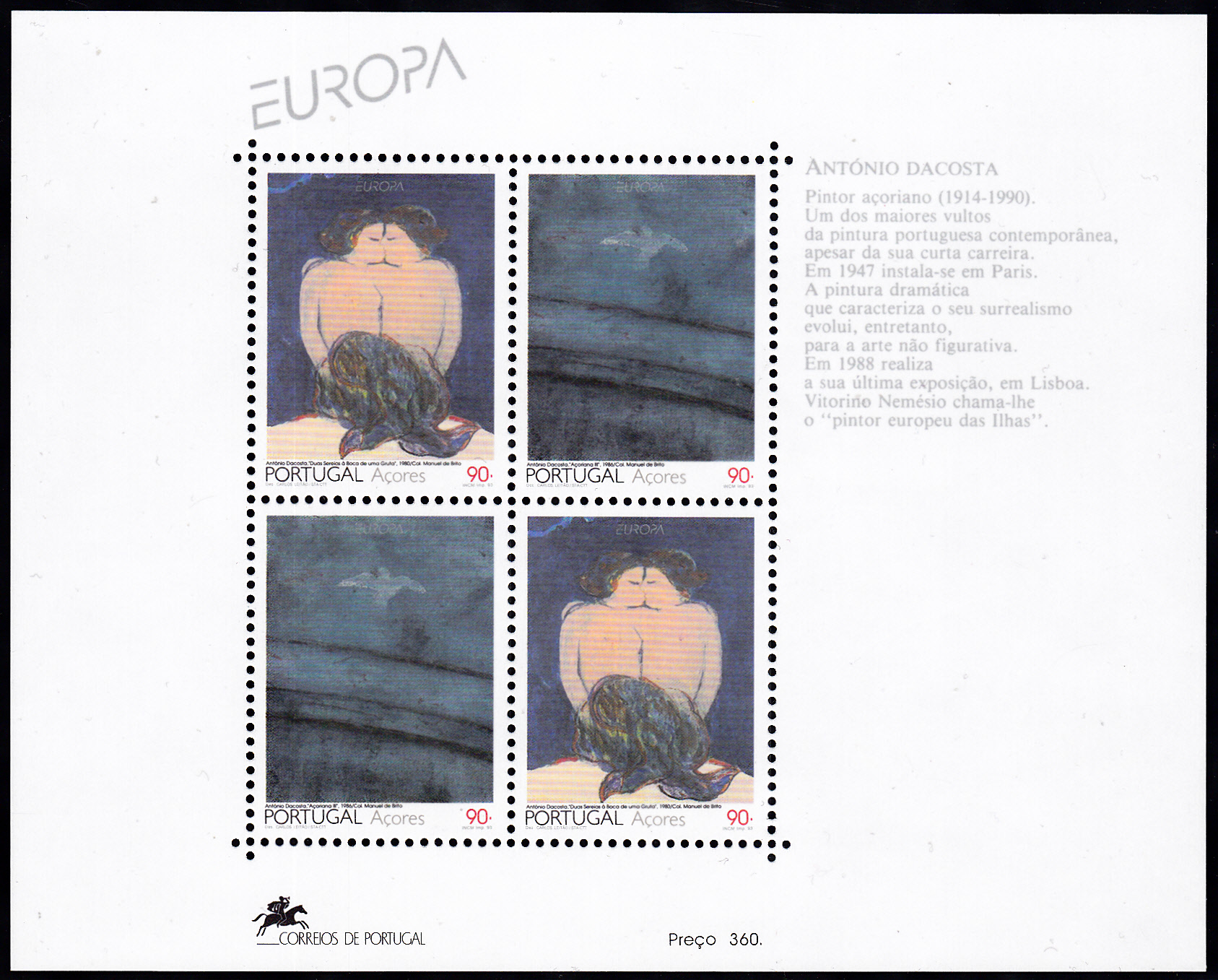 In Portugal Azoren ist die Europamarke MiNr 434 zusammen mit einer weiteren Europamarke (MiNr 435) mit dem Gemälde " Açoriana III" von António Dacosta (1914-1990) auch in einem Block erschienen. Die Auflage des Blockes betrug 150 000 Stück. Hier ein postfrischer Block: