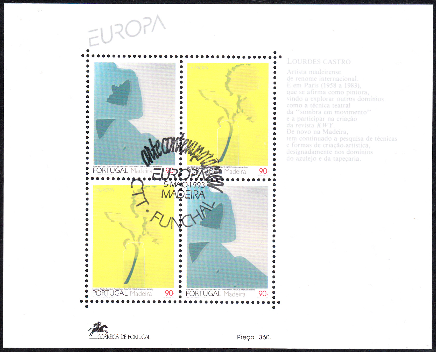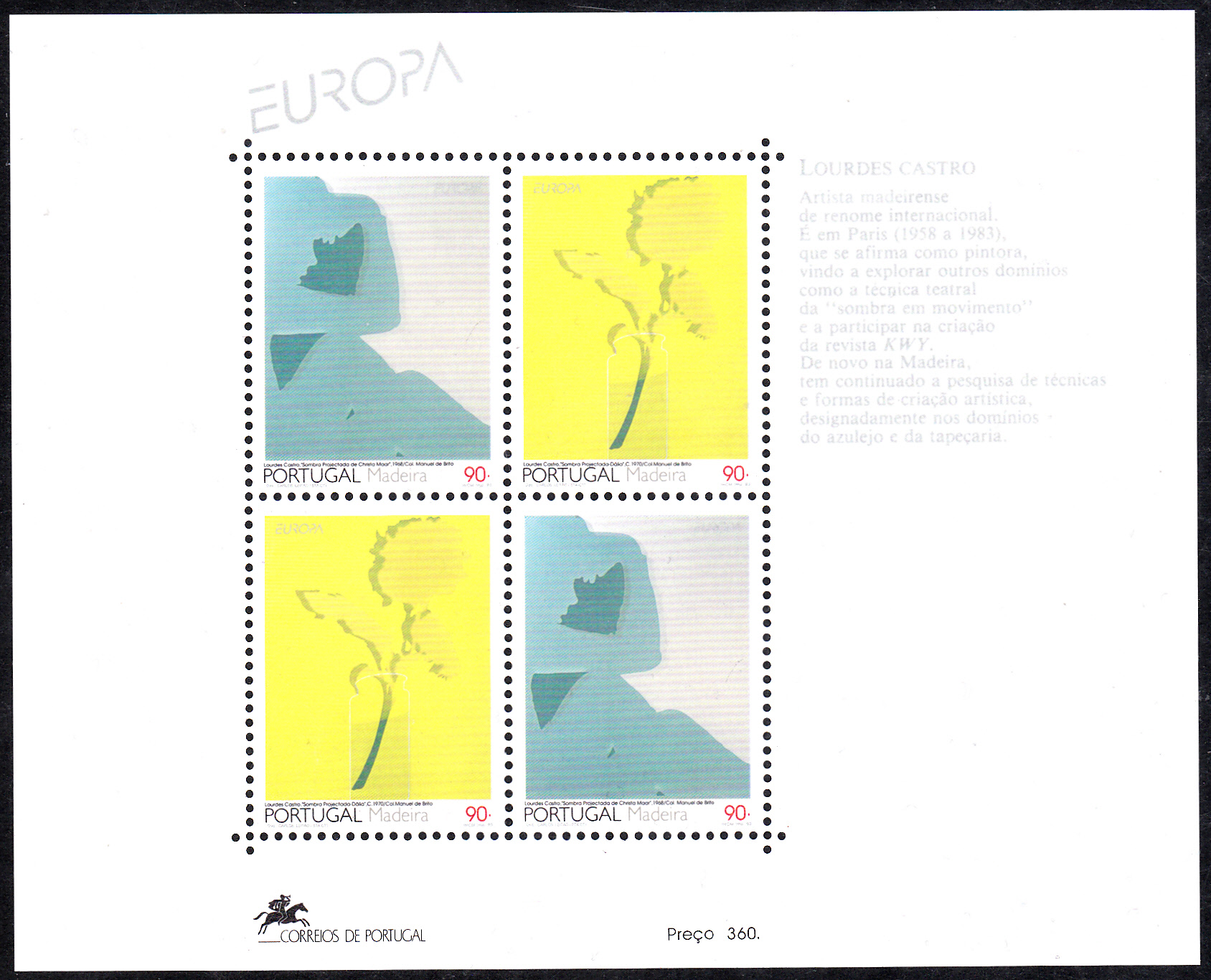 In Portugal Medeira ist die Europamarke MiNr 162 zusammen mit einer weiteren Europamarke (MiNr 163) mit dem Gemälde "Sombra Projectada-Dália" von António Dacosta (1914-1990) auch in einem Block erschienen. Die Auflage des Blockes betrug 160 000 Stück. Hier ein postfrischer Block: