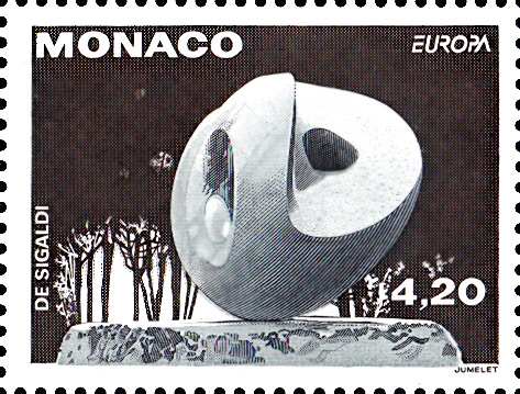 Die Europamarken 1993 zum Gemeinschaftsthema " Zeitgenössische Kunst" sind in Monaco am 4. Mai 1993 erschienen. Hier die Marke zu 4,20 Franc mit der Abbildung der Skulptur "Evolution" von Emma de Sigaldi (1910-2010). Die Marke gibt es in zwei verschiedenen Zähnungen: A = gez. K 12 1/4:12 1/2 (aus Bögen) und C = gez. Ks 13:12 1/2 (aus Blöcken).