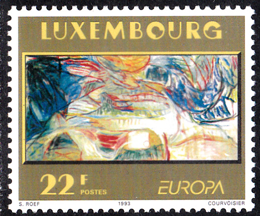 Die Europamarken 1993 zum Gemeinschaftsthema "Zeitgenössische Kunst" sind in Luxemburg am 10. Mai 1993 erschienen. Hier die Marke zu 22 Franc mit der Abbildung des Gemälde "So Close" von Sonja Roef (*1952). Die Auflage der Marke betrug 1 000 000 Stück.