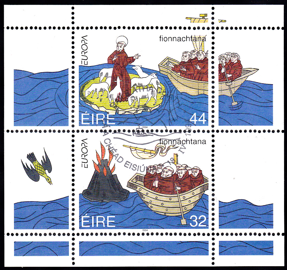In Irland erschienen die Europamarken 1994 zum Gemeinschaftsthema "Entdeckungen und Erfindungen" am 18. April 1994 mit Darstellungen zu den Seereisen des hl. Brendan (6. Jh., irischer Mönch) nach Holzschnitten auch in einem Block. Hier ein postfrischer Block: