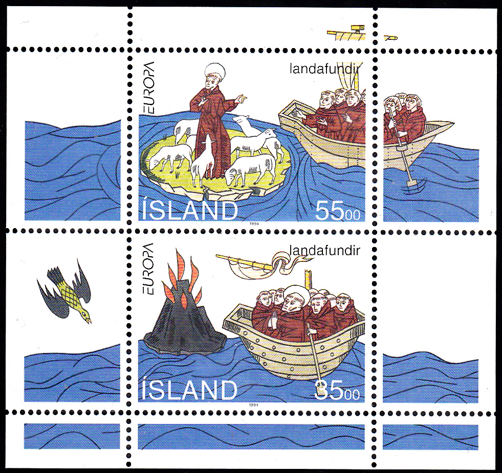 In Island erschienen die Europamarken 1994 zum Gemeinschaftsthema "Entdeckungen und Erfindungen" am 18. April 1994 mit Darstellungen zu den Seereisen des hl. Brendan (6. Jh., irischer Mönch) nach Holzschnitten auch in einem Block. Hier ein postfrischer Block: