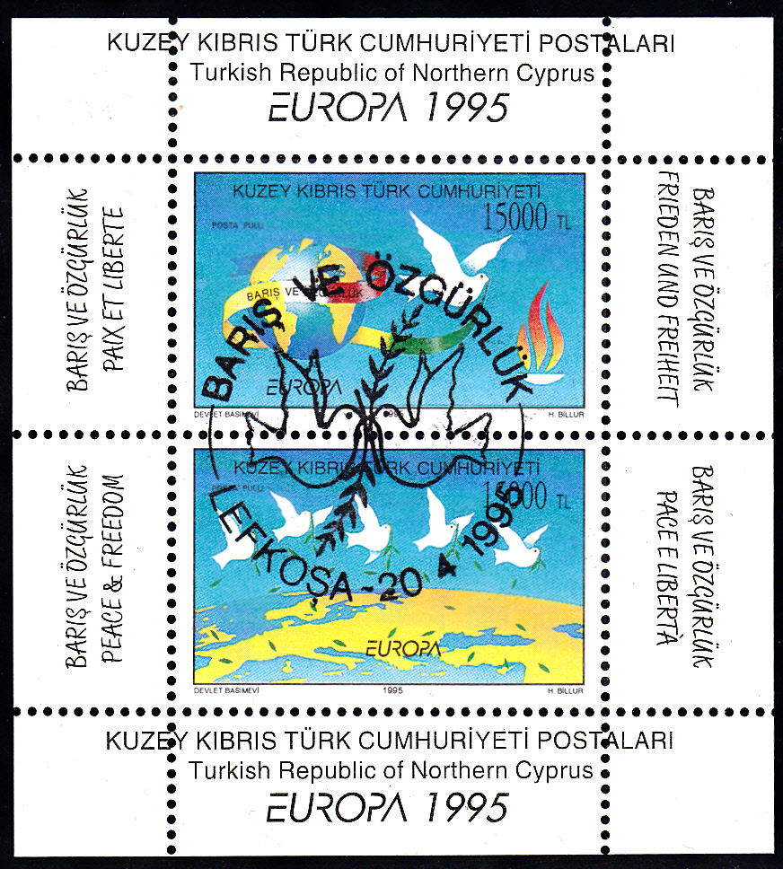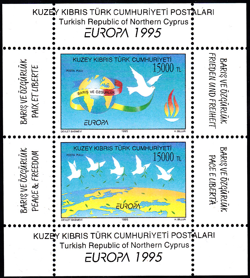 In Türkisch-Zypern erschien am 20. April 1995 eine Blockausgabe mit zwei Marken zum Gemeinschaftsthema "Frieden und Freiheit". Auf der ersten Marke zu 15000 Lira (MiNr 395) werden die Erdkugel, eine Friedenstaube und die Flamme der Freiheit abgebildet und auf der Marke zu ebenfalls 15000 Lira (MiNr 396) sind Friedenstauben über Europa zu sehen. Hier ein postfrischer Block, der eine Auflage von 200 000 Stück hatte.
