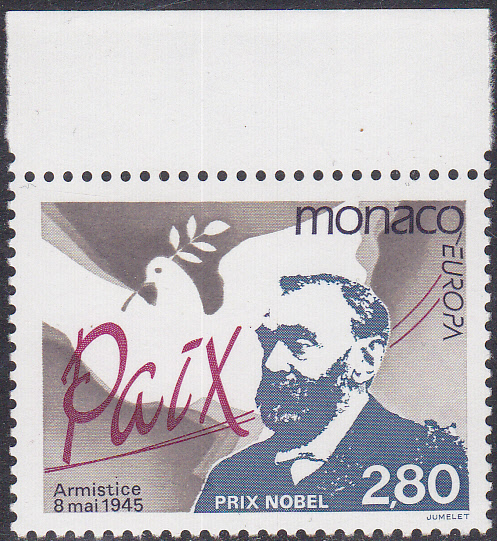 In Monaco erschienen die Europamarken 1995 am 8. Mai 1995 zum Gemeinschaftsthema "Frieden und Freiheit". Hier die Marke zu 2,80 Francs mit der Abbildung von Alfred Nobel (1833-1896), schwedischer Chemiker und Industrieller und einer Friedenstaube.