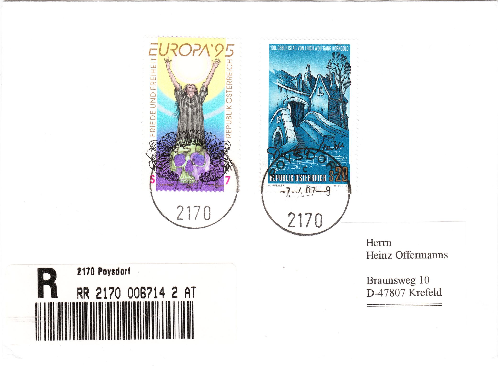 Europamarke 1995 aus Österreich am 07.04.1997 in MiF auf Brief per Einschreiben nach Deutschland: