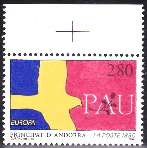 In Andorra erschienen bei der französischen Post die Europamarken 1995 am 29. April 1995 zum Gemeinschaftsthema "Frieden und Freiheit". Hier eine Marke zu 2,80 Francs mit einer Friedenstaube als Randstück mit Passerkreuz. Die Auflage betrug 178 283 Stück.