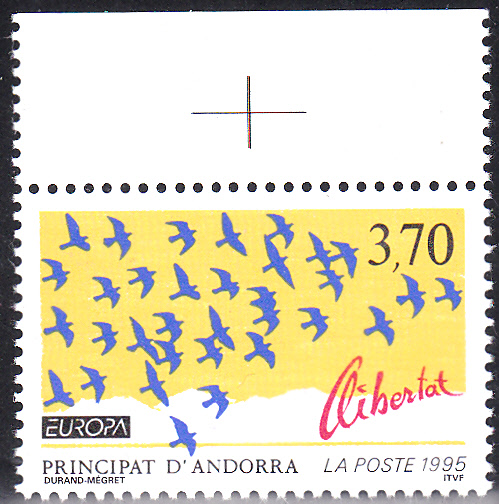 In Andorra erschienen bei der französischen Post die Europamarken 1995 am 29. April 1995 zum Gemeinschaftsthema "Frieden und Freiheit". Hier eine Marke zu 3,70 Francs mit Friedenstauben als Randstück mit Passerkreuz. Die Auflage betrug 145 325 Stück.
