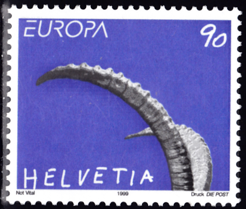 In der Schweiz erschien die Europamarke 1999 zum Gemeinschaftsthema "National- und Naturparks" am 5. Mai 1999. Hier zeige ich die Marke zu 90 Rappen mit einer Abbildung zum Schweizerischer Nationalpark. Sie zeigt Steinbockhörner. Die Marke erschien in einer Auflage von 4 691 000 Stück.
