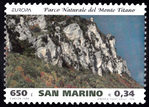In San Marino erschienen die Europamarken 1999 zum Gemeinschaftsthema "National- und Naturparks" am 27. März 1999. Hier eine Marke zu 650 L / 0,34 € mit einer Abbildung aus dem Naturpark Monte Titano.