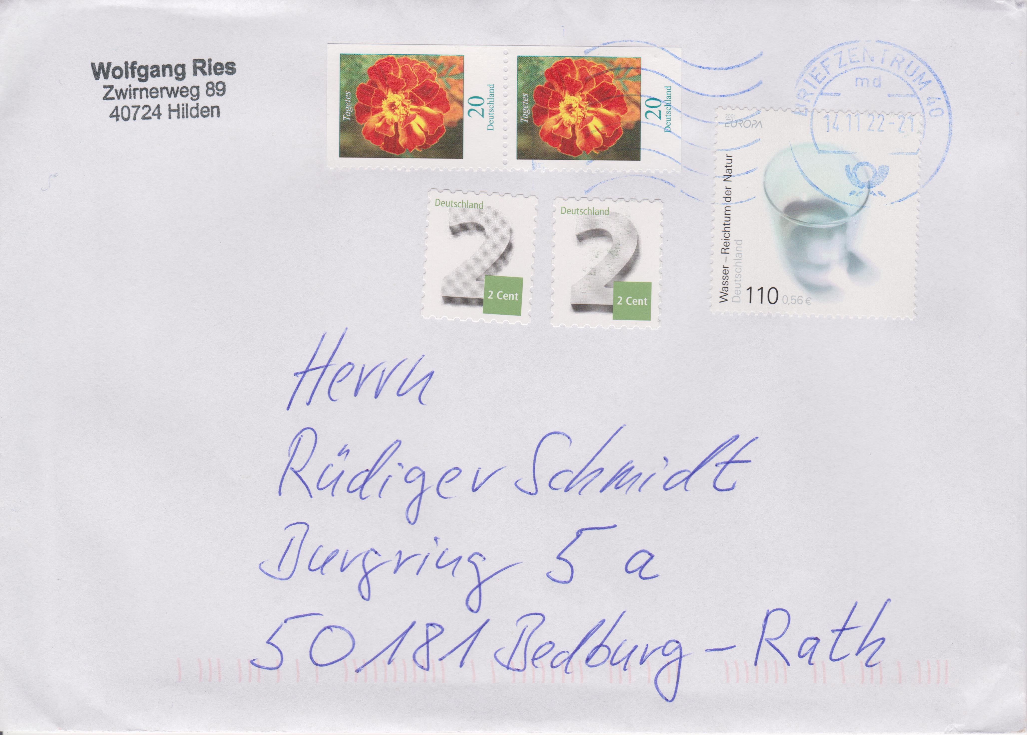 Späte Verwerdung der Deutschland MiNr. 2185 mit Zusatzfrankatur auf Brief am 14.11.2022 mit Maschinenstempel mit Welleneinsatz BRIEFZENTRUM 40: