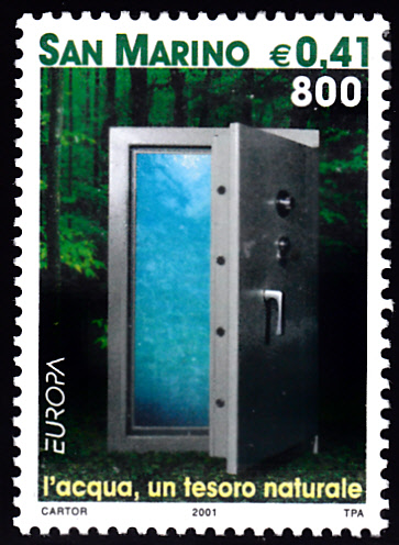 In San Marino erschienen die Europamarken 2001 zum Gemeinschaftsthema "Lebensspender Wasser" am 17. April 2001. Diese Marke zu 800 Lire / 0,41 € zeigt Wald und einen mit Wasser gefüllten Tresor. Die Auflage der Marke betrug 130 000 Stück.