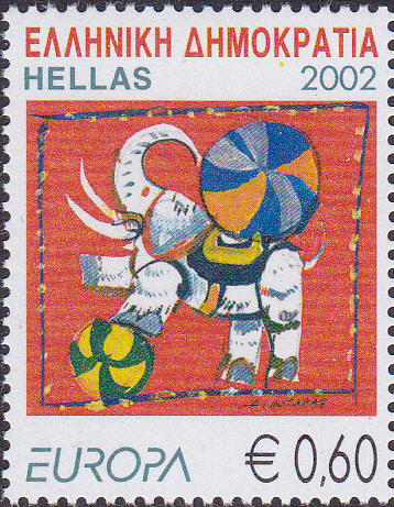 Die Europamarken 2002 zum Thema "Zirkus" erschienen in Griechenland am 9. Mai 2002. Hier die Marke zu 0,60 € aus dem Bogen (MiNr 2110 A, vierseitig gez. K 13 1/4:13 3/4) mit einer Darstellung zur Elefantendressur. Die Auflage dieser Marke beträgt 505 096 Stück.