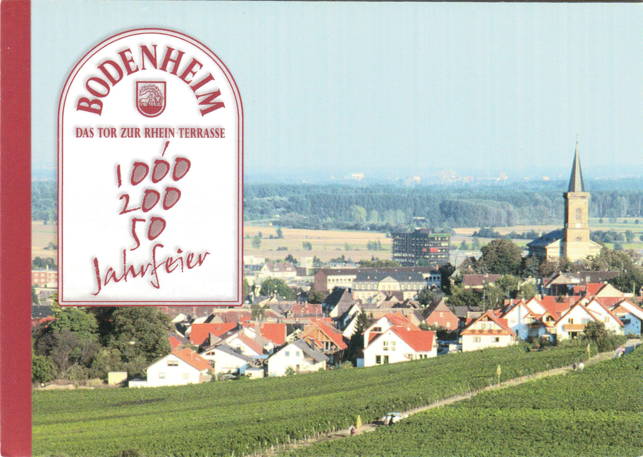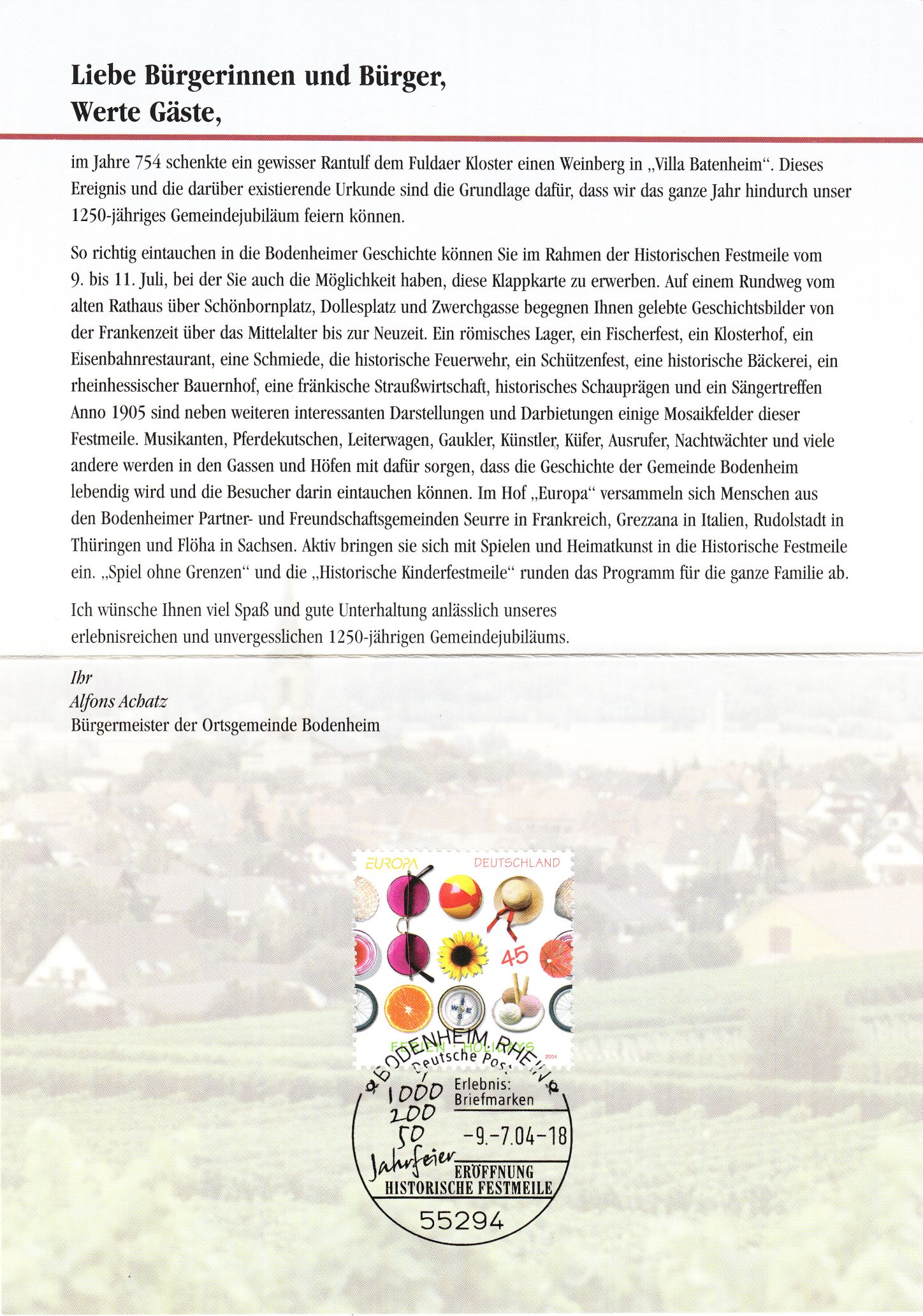 Diese Klappkarte mit einer Europamarke 2004 wurde in einer Auflage von 1000 Stück als Stempelvorlage vom "Erlebnis: Briefmarken" Team Pforzheim zum 1250-jährigen Gemeindejubiläum von Bodenheim aufgelegt: