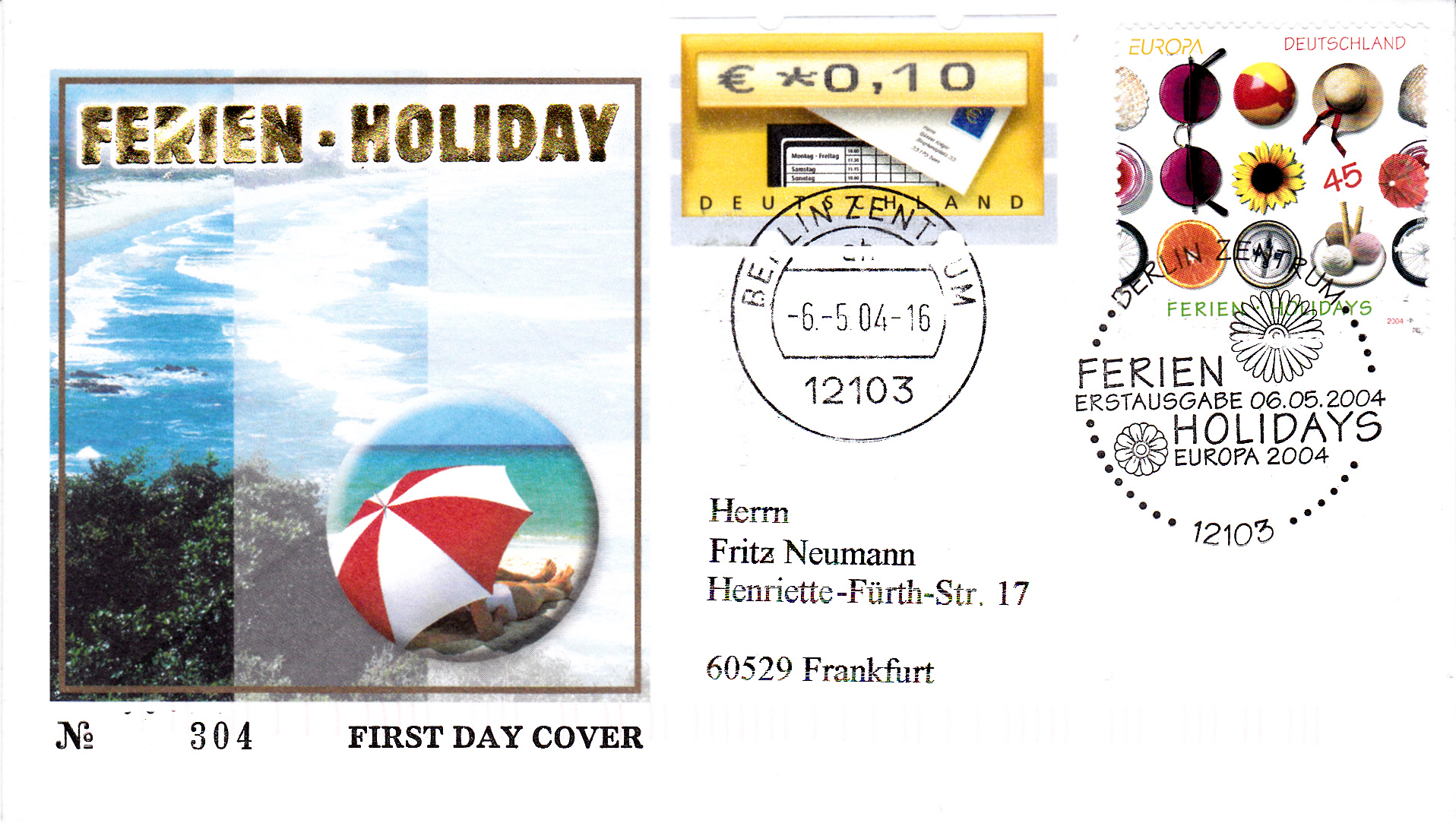 Auf diesem Ersttagsbrief wurde eine Europamarke mit dem Ersttagsonderstempel aus Berlin gestempelt, die Zusatzfrankatur einer Automatenmarke erhielt den normalen Tagesstempel.