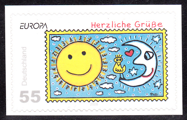 Die Europamarke 2008 der Deutschen Post erschien auch als selbstklebende Marke in Markenheftchen und Einzelmarken aus Folienbogen. Die Auflage betrug 44 765 000 Stück. Hier eine Einzelmarke aus Folienbogen: