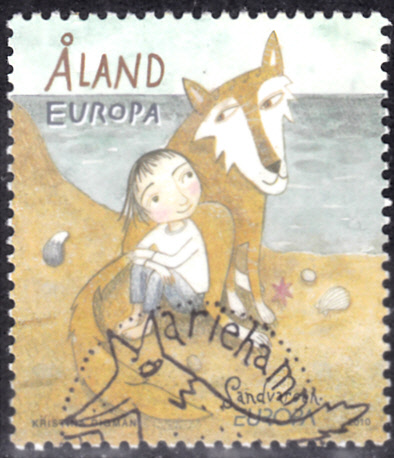 In Finnland erschien auf den Alandinseln eine Europamarke 2010 zum Gemeinschaftsthema "Kinderbücher" am 19. April 2010. Hier zeige ich die Marke zum Europatarif (zur Zeit der Ausgabe 0,85€) Figuren aus "Zackarina und der Sandwolf"" von Åsa Lind (geb.1958, Schriftstellerin). Die Auflage der Marke betrug 180 000 Stück.