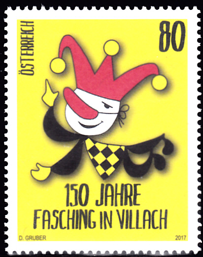 Zum Jubiläum "150 Jahre Fasching in Villach" ist in Österreich diese Marke (MiNr 3321) mit einem Narr mit Narrenkappe, dem Emblem der Villacher Faschingsgilde erschienen.