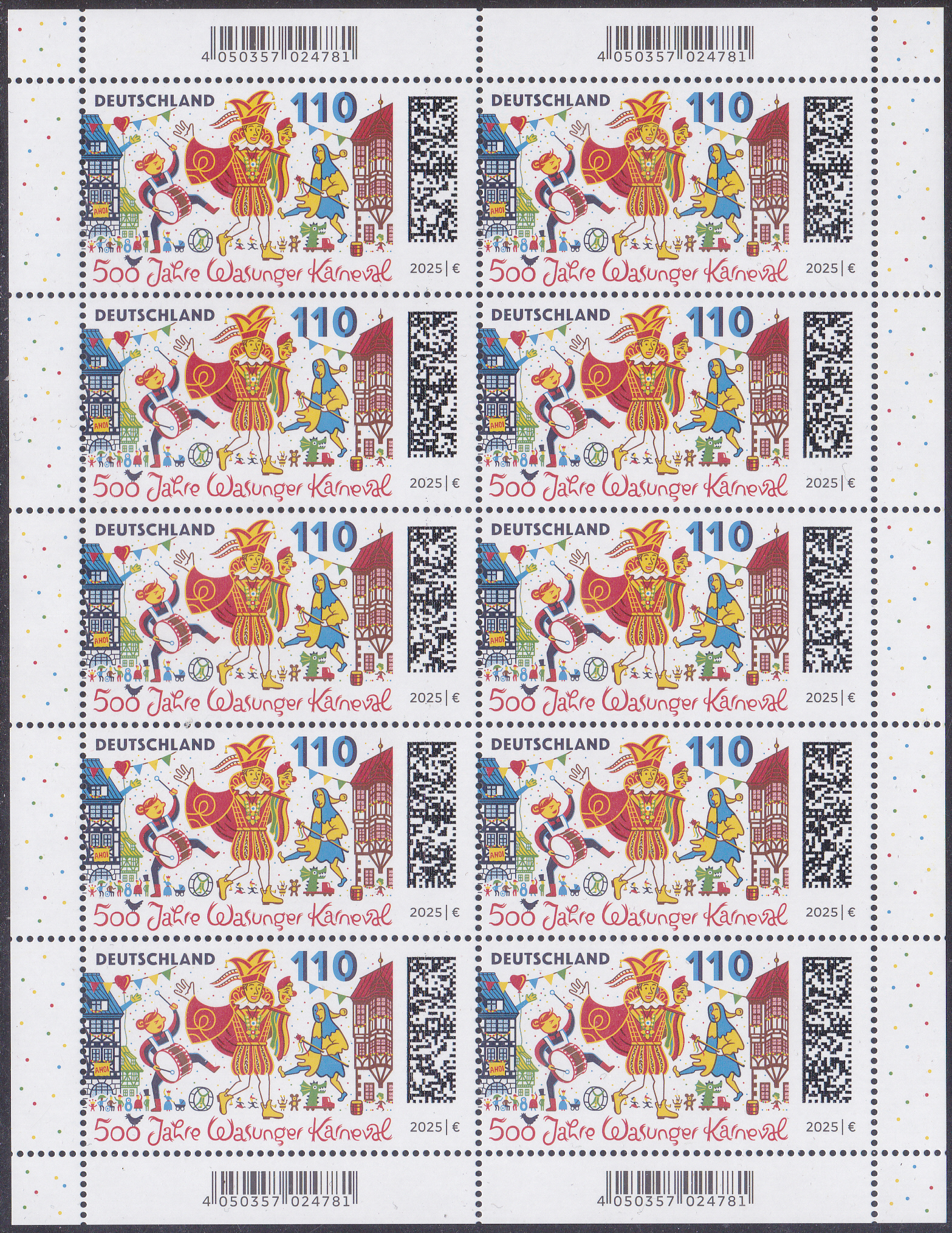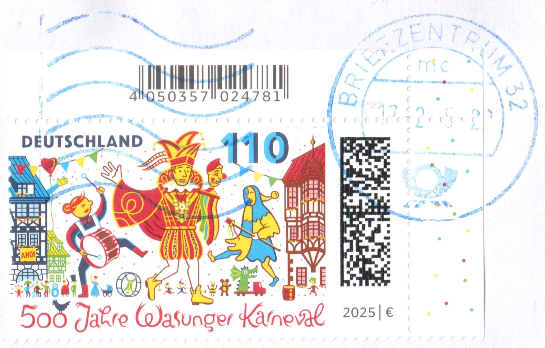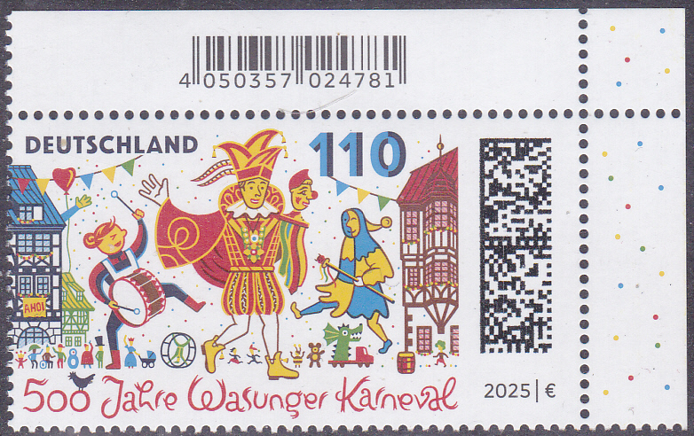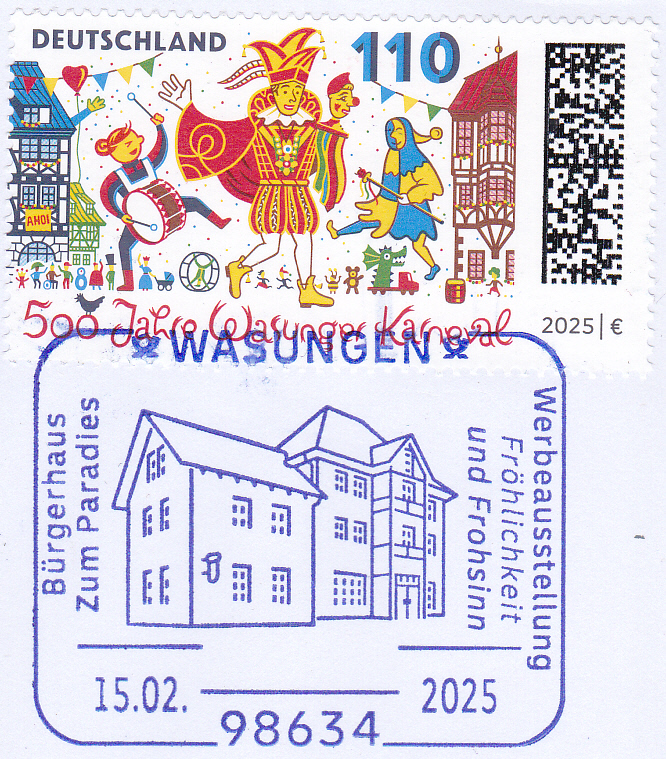 Auf dieser Marke (MiNr 3888) zum Thema "500 Jahre Wasunger Karneval" sehen wir eine Darstellung zum Wasunger Karnevalsumzug mit Trommlerin, Prinz und Narr "Höpfer" vor dem Rathaus und den Fachwerkhäusern am Markt.