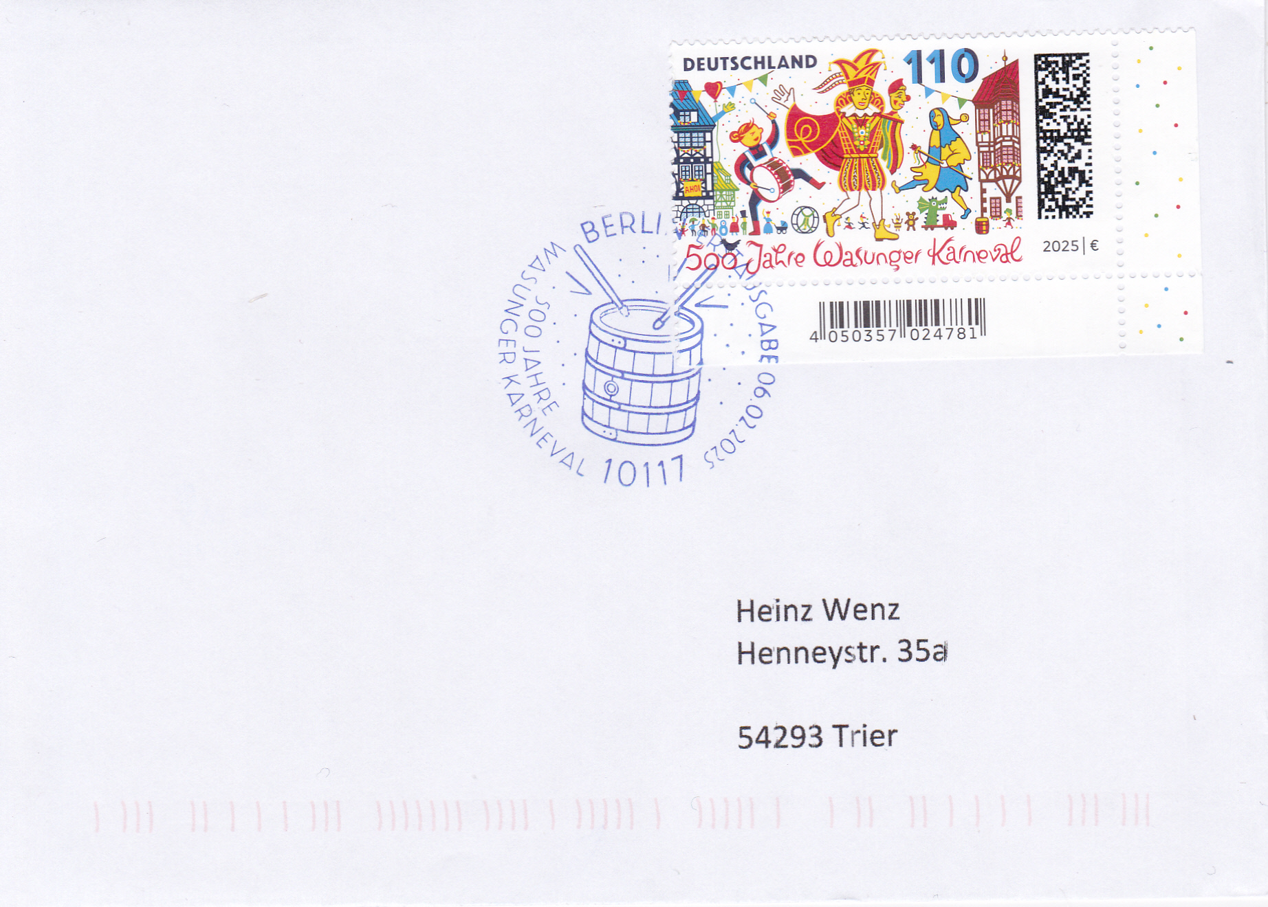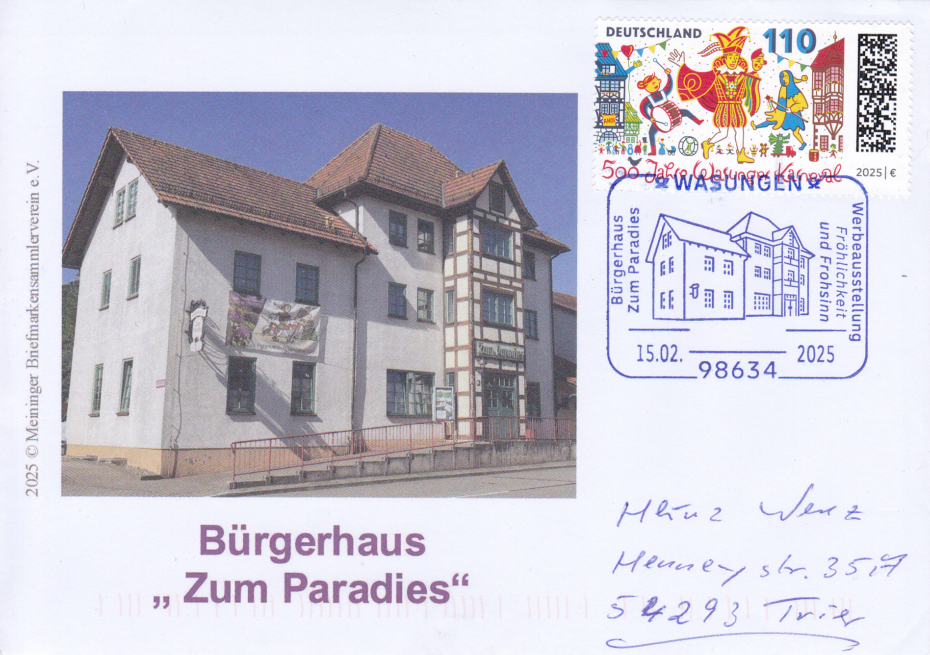Brief mit Einzelfrankatur der Marke (MiNr 3888) zum Thema "500 Jahre Wasunger Karneval" und einem passenden Sonderstempel aus Wasungen vom 15.2.2025