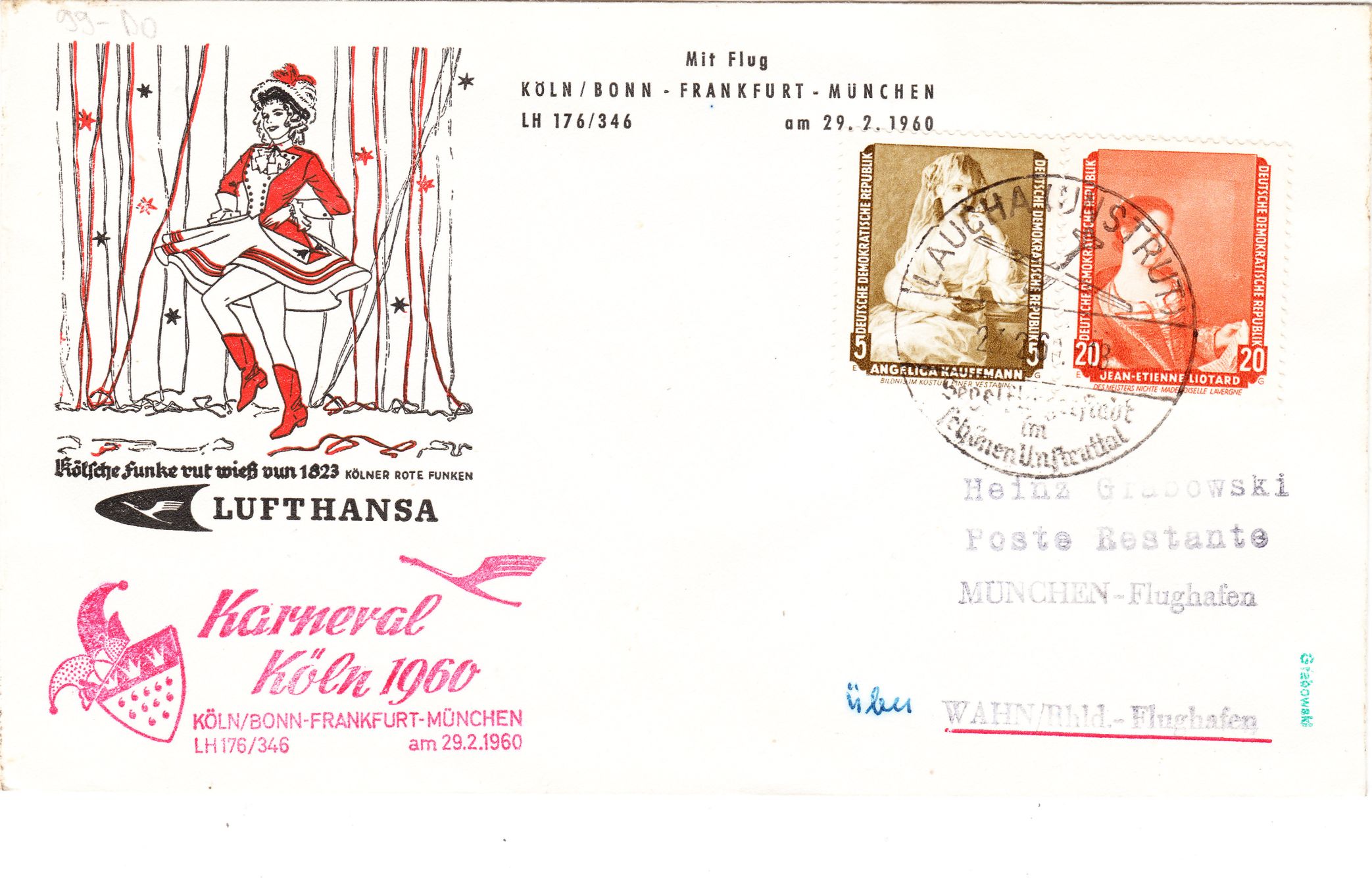 Dieser am 23.02.1960 in der DDR als Zuleitungspost aufgegebene Beleg dokumentiert vorderseitig "Karneval Köln 1960" per Cachetstempel zum Hinflug LH 176/346 am 29.02.1960 von Köln/Bonn über Frankfurt nach München: