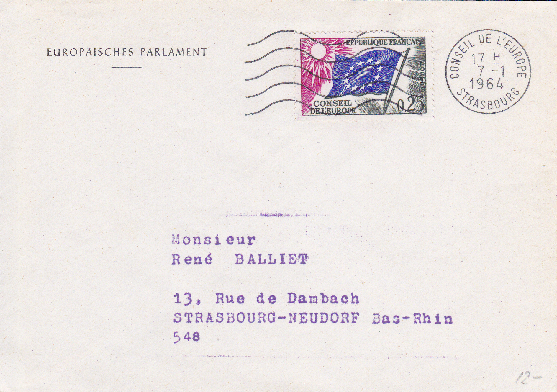 Dienstbrief mit der Dienstmarke zu 0,25 Franc vom 7.1.1964.