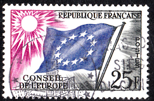 Hier ein gestempeltes Exemplar der Dienstmarke Europarat MiNr. 4 der Wertstufe zu 25 Francs: