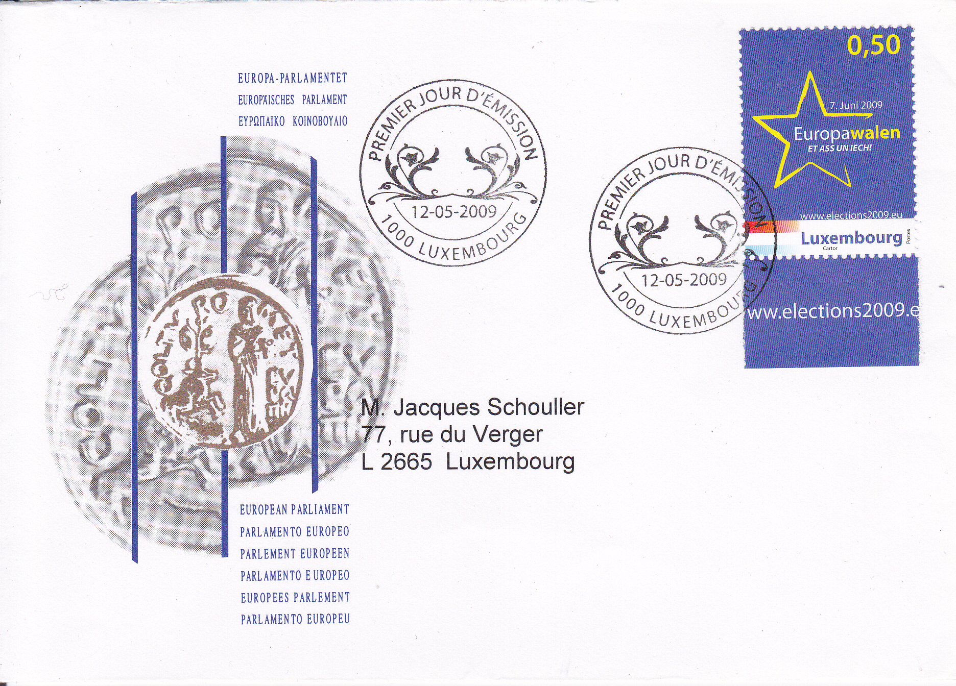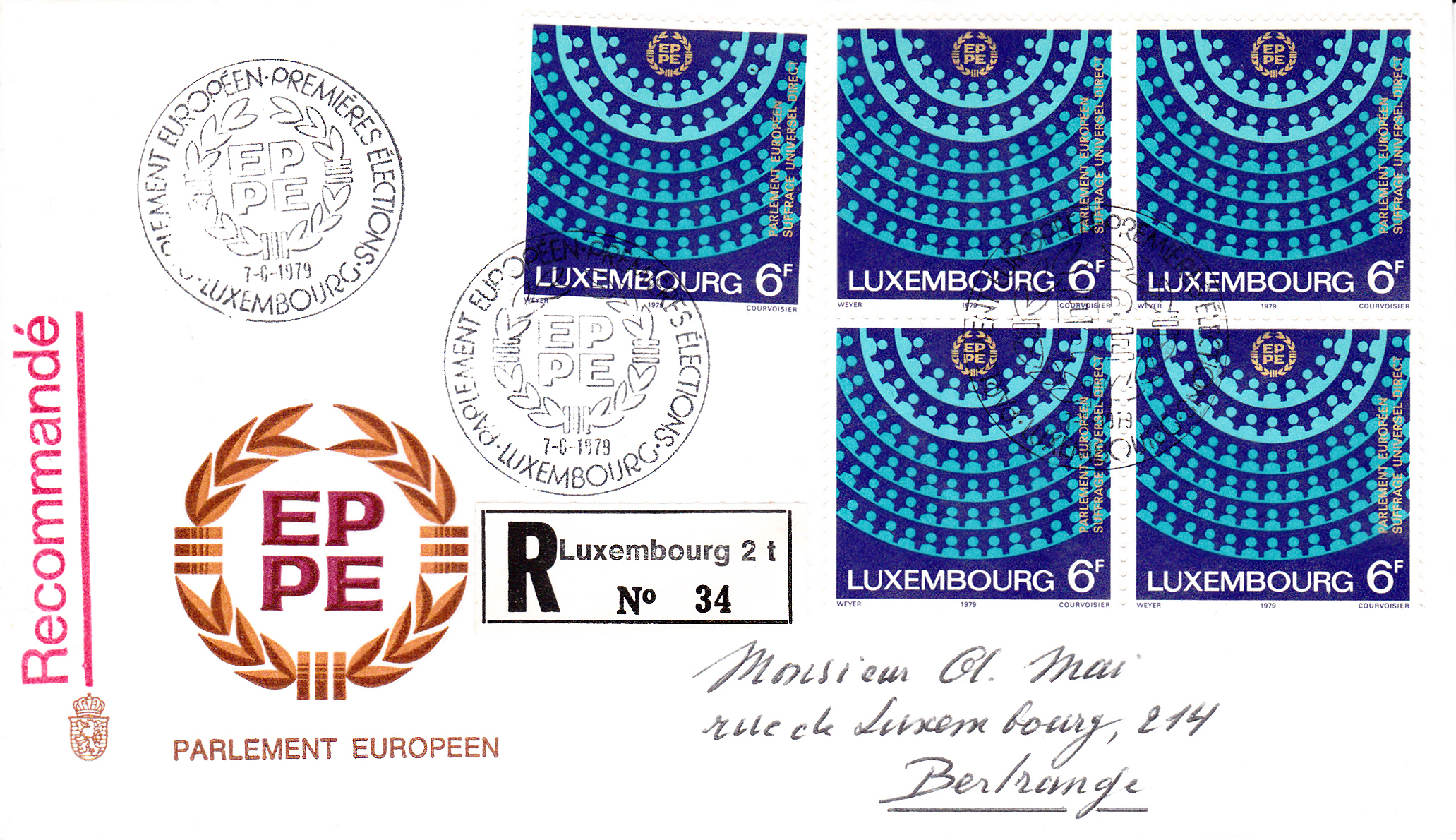 Einschreibebrief mit einer Mehrfachfrankatur der Marke zur ersten Direktwahl zum Europäischen Parlament aus Luxemburg (MiNr 993)und dem Ersttagsonderstempel aus Luxembourg.