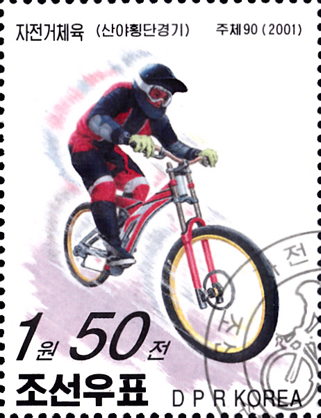 Aus Korea-Nord kommt diese Marke (MiNr 4499) aus einer Serie "Radsport". Sie zeigt einen Mountainbik-Fahrer beim Downhill.