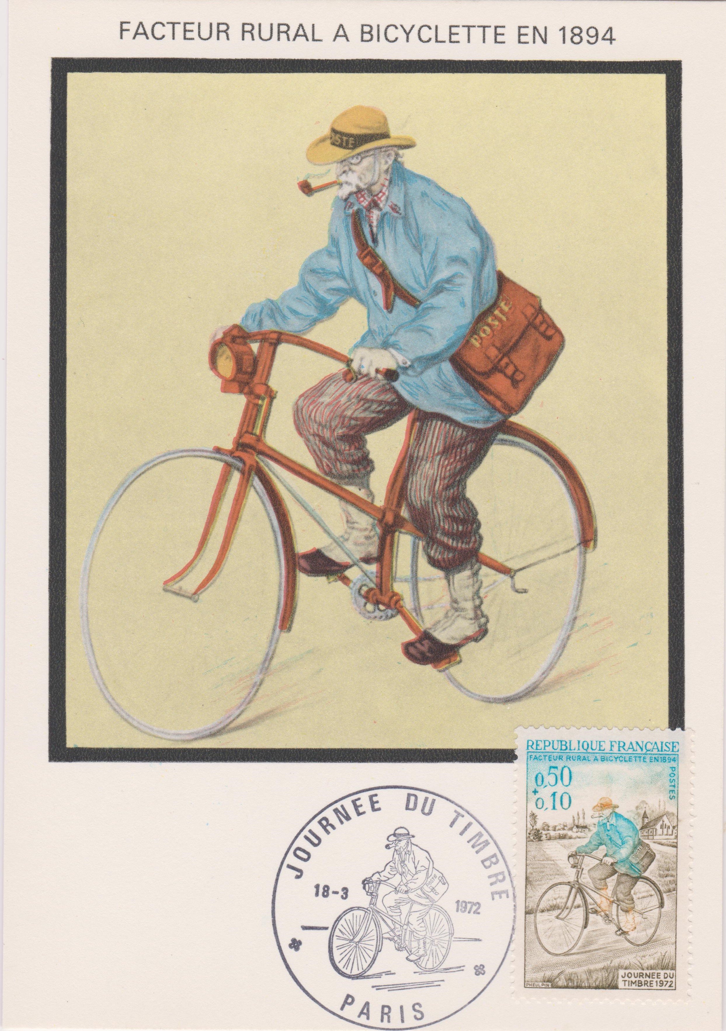 Frankreich MiNr. 1784 erschien am 18.03.1972 zum Tag der Briefmarke 1972 und zeigt einen Landbriefträger auf seinem Fahrrad, hier als Maximumkarte mit Ersttagsstempel PARIS: