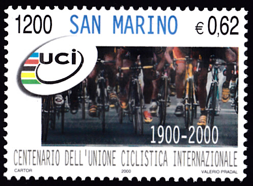 Zum Jubiläum "100 Jahre Internationaler Radsportverband" erschien in Italien am 14.4.2000 diese Marke (MiNr 2691), die einen Radsportler um 1900 zeigt.