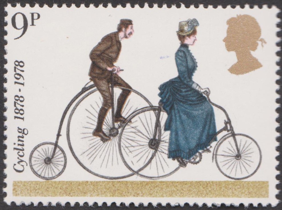 GB MiNr. 773 zeigt einen Mann und eine Frau im 19. Jahrhundert beim Fahrradfahren: