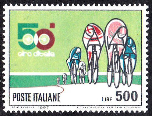 In Italien erschien zum 50. Giro d'Italia im Jahre 1967 diese Marke (MiNr 1231) mit der Darstellung einer "Bergetappe".