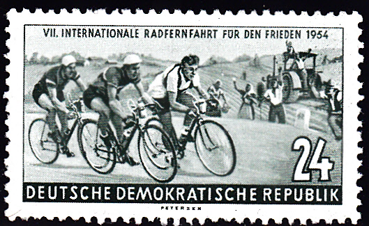 In der DDR erschien zur Internationalen Radfernfahrt für den Frieden 1957 Prag-Berlin-Warschau eine Marke zu 5Pf (MiNr 568) mit einer Streckenskizze, der Karlsbrücke in Prag, dem Roten Rathaus in Berlin und dem Kulturpalast in Warschau im Markenbild.