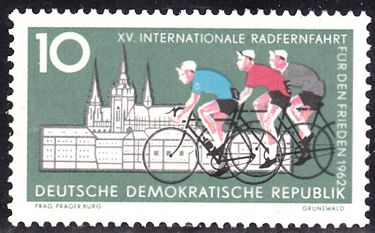 Die nächste Markenausgabe der DDR erschien dann zur Internationale Radfernfahrt für den Frieden 1962 Berlin - Prag - Warschau. Auf der Marke zu 10Pf (MiNr 886) sehen wir drei Radrennfahrer vor der Prager Burg.