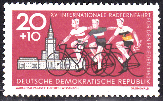 Die Marke zu 20+10Pf (MiNr 887) zeigt Radrennfahrer in Trikots in den Nationalfarben der Mannschaften der Volksrepublik Polen, der CSSR und der DDR vor dem Palast für Kultur und Wissenschaft in Warschau.