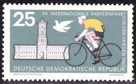 Die Marke zu 25Pf der gleichen Serie (MiNr 888) bildet einen Radrennfahrer im gelben Trikot des Führenden in der Gesamtwertung vor dem Roten Rathaus in Berlin und eine Friedenstaube ab.