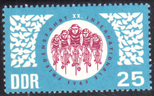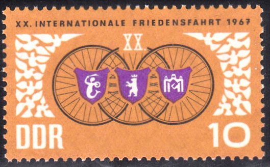 Zur XX. Internationale Radfernfahrt für den Frieden Warschau - Berlin - Prag ist 1967 in der DDR diese Marke zu 10Pf (MiNr 1278) mit den