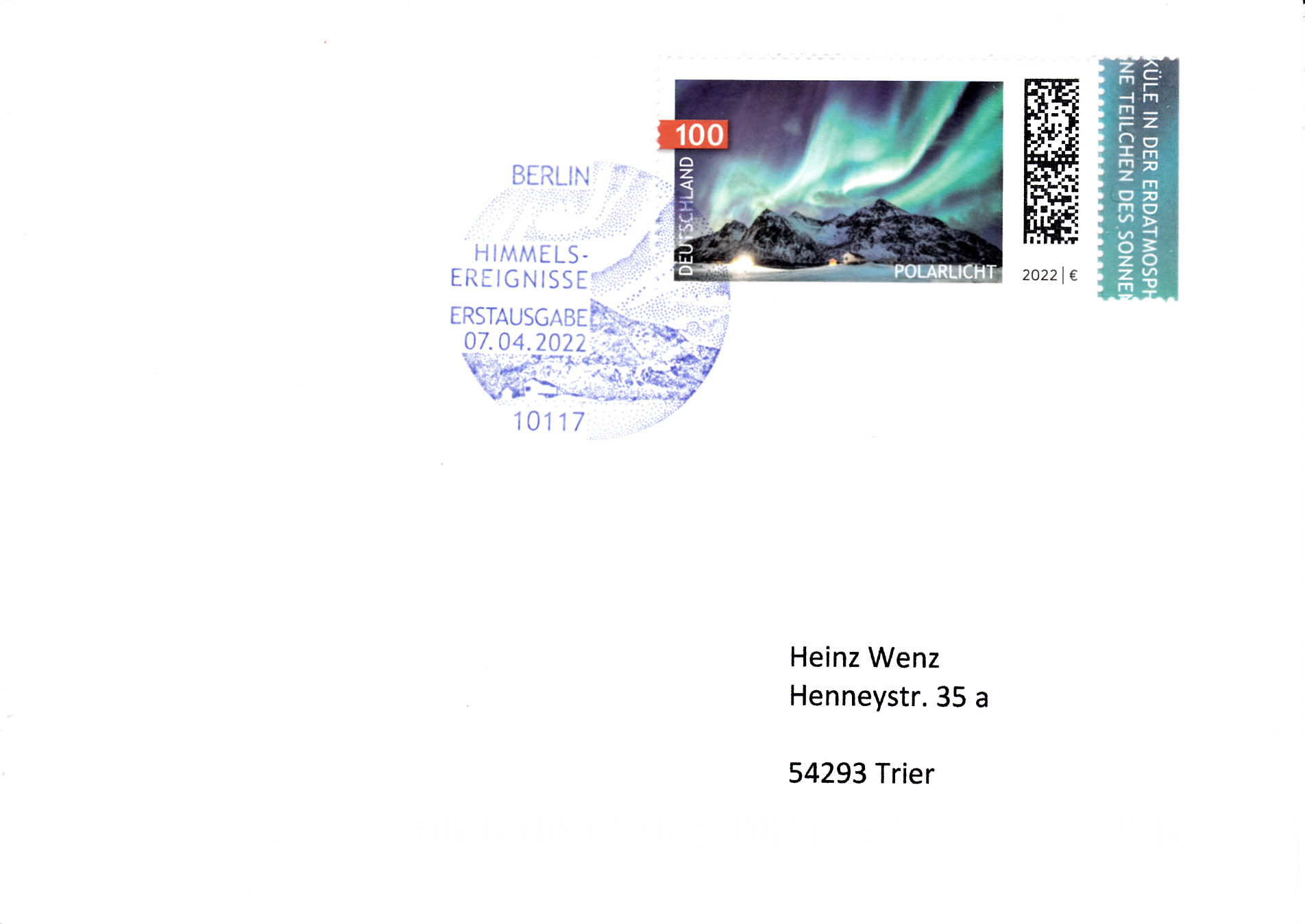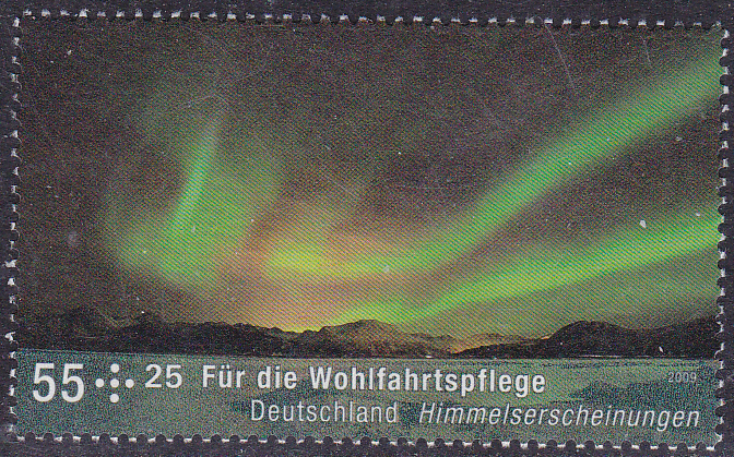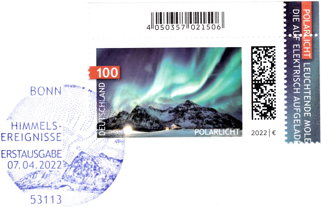 In der Serie Himmelsereignisse ist bei der Deutschen Post eine Marke (MiNr 3680) mit der Abbildung von Polarlicht erschienen. Hier zeige ich eine Marke vom Eckrand mit EAN-Codierung.