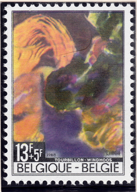 Auf dieser Marke aus Belgien aus einer Zuschlagserie zu Gunsten der Katastrophenhilfe wird ein Gemälde von Pol Mara (1920-1998) mit dem Titel "Windhose" gezeigt.