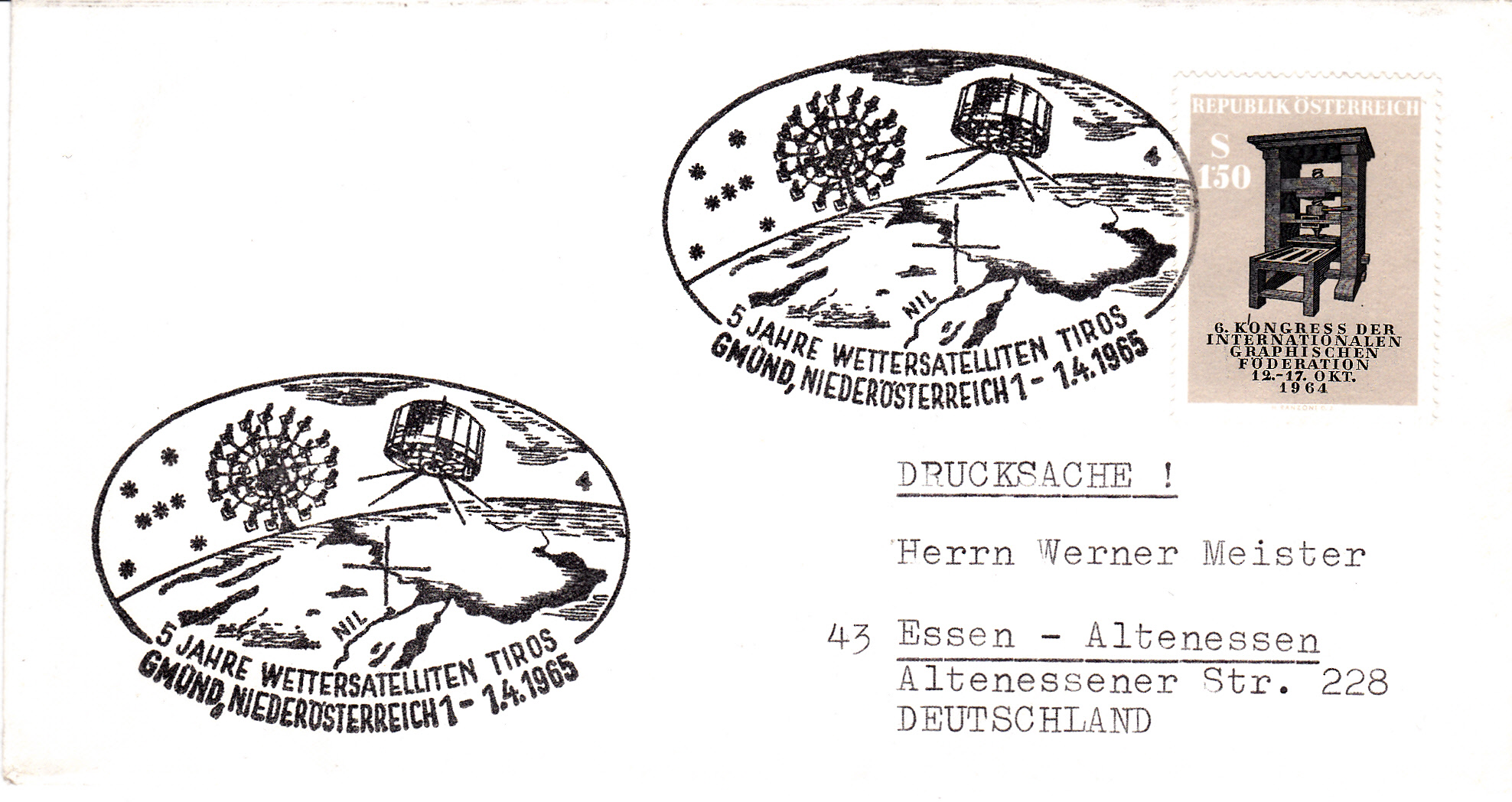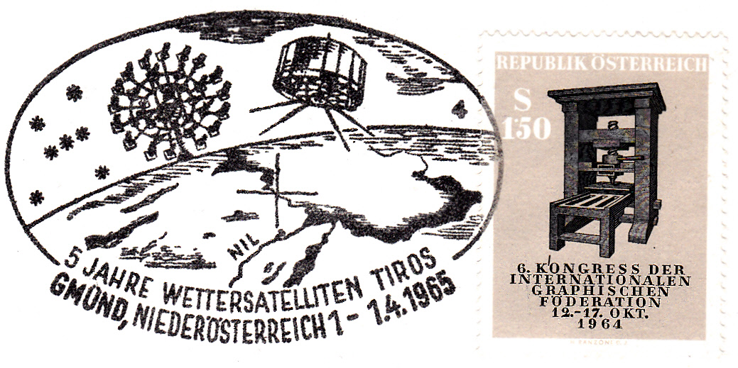 Sonderstempel aus Gmünd vom 1.1.1965 zum 5.Jahrestag des Starts von Tyros 1 mit der Kennziffer "4".