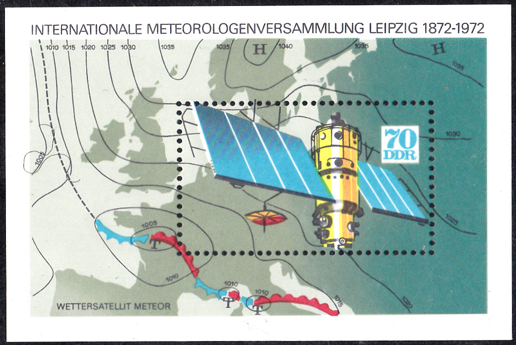 Zum Jubiläum "100 Jahre Meteorologen-Versammlungen Leipzig" erschien in der DDR dieser Block (MiNrBlock 36 mit Marke MiNr 1747), der den Wettersatellit Meteor im Markenbild und eine Wetterkarte auf dem Block abbildet.