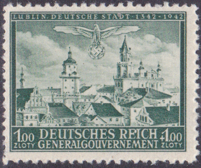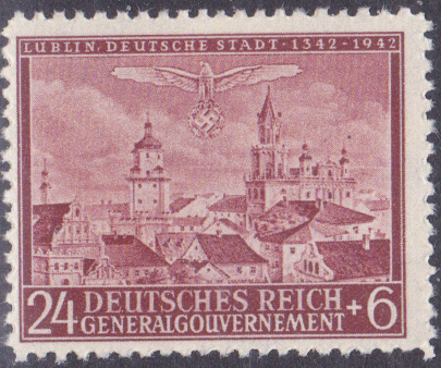 Zum Jubiläum "600 Jahre Stadt Lublin" sind 1942 vier Marken erschienen. Die Marke zu 12 + 8 Gr (MiNr 92) zeigte einen Block auf Alt-Lublin.